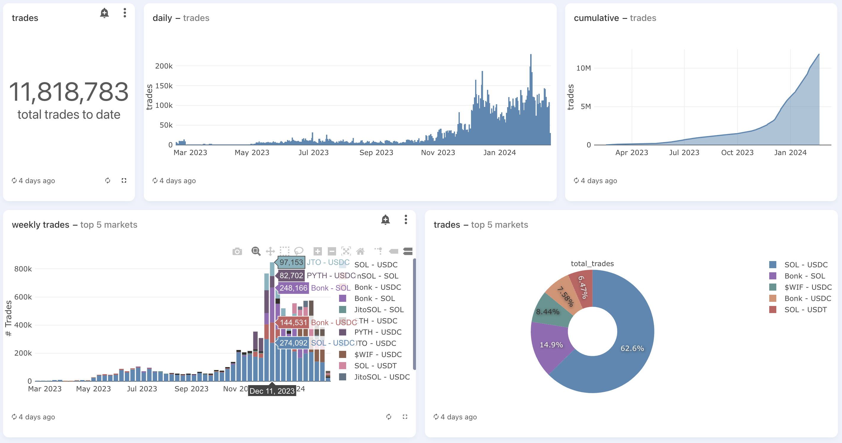The data is then aggregated on a weekly basis, summing up trades, volume, and fees. Finally, the markets are ranked weekly by trading volume in USD, and the top 5 markets are selected and displayed. This comprehensive analysis offers a snapshot of the most active markets on Solana, providing valuable insights into their weekly performance.