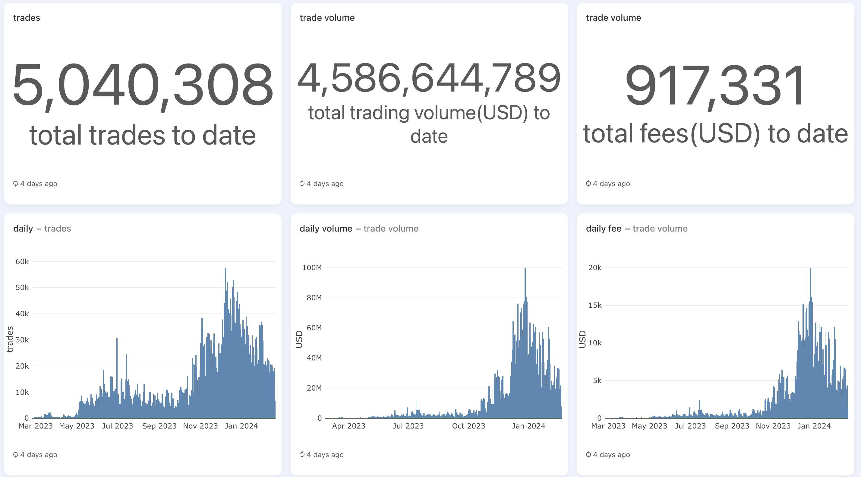 Here, we see 6 widgets. 1) Total trade volume, 2) daily trade volume, 3) cumulative trade volume,  4) total trade fees, 5) daily fees for trades, and 6)cumulative fees for trades. We can infer that the volume of fees is quite high and which in a way is a sign of good health and profits for the liquidity provider and for the projectX.